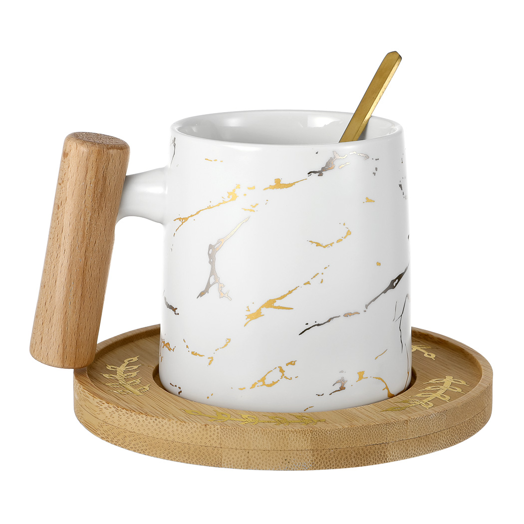 Marble Ceramic Mug with Wood Handle with Coaster & Spoon, 235mL (White)